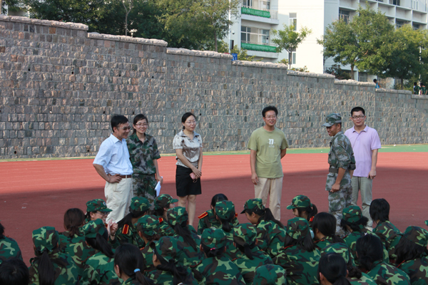 党总支书记张鸣,常务副院长阎瑜,党总支副书记兼副院长魏琳,分团委书记刘名森一行来到训练场走访2011级新生军营,对在烈日下坚持刻苦训练的新生表示慰问和鼓励。