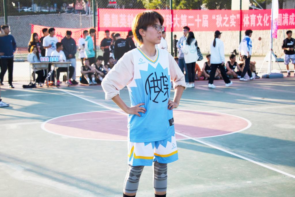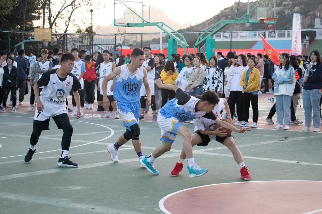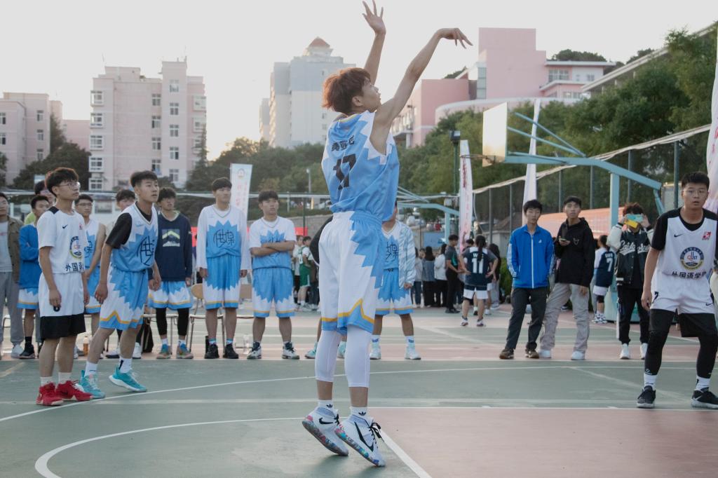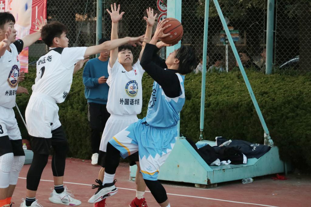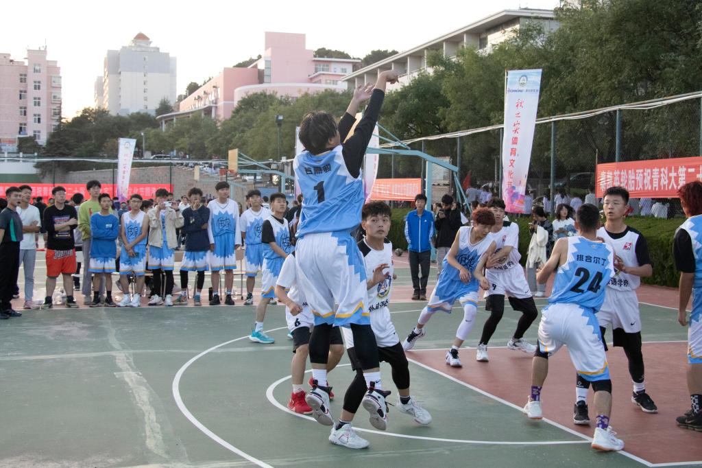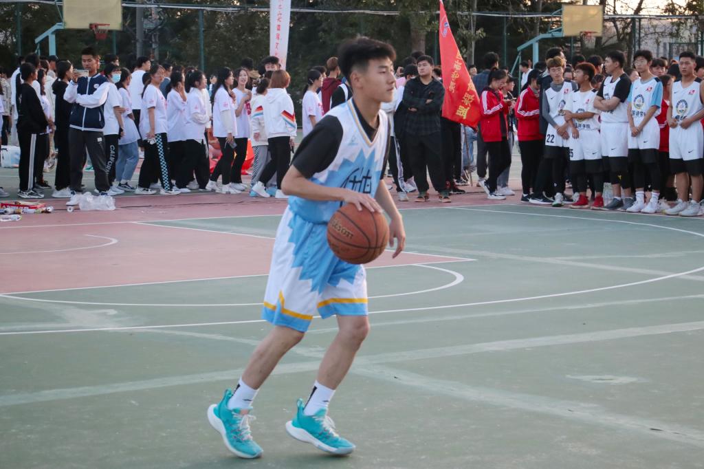 男篮比赛继续,排合尔丁将对方传的球一把挡下,他左手持球,一个快速变向,加速冲到篮下,高高跃起,将篮球从指间送入篮筐,动作一气呵成,飘逸洒脱,眼神里充满了传媒学子的朝气。
