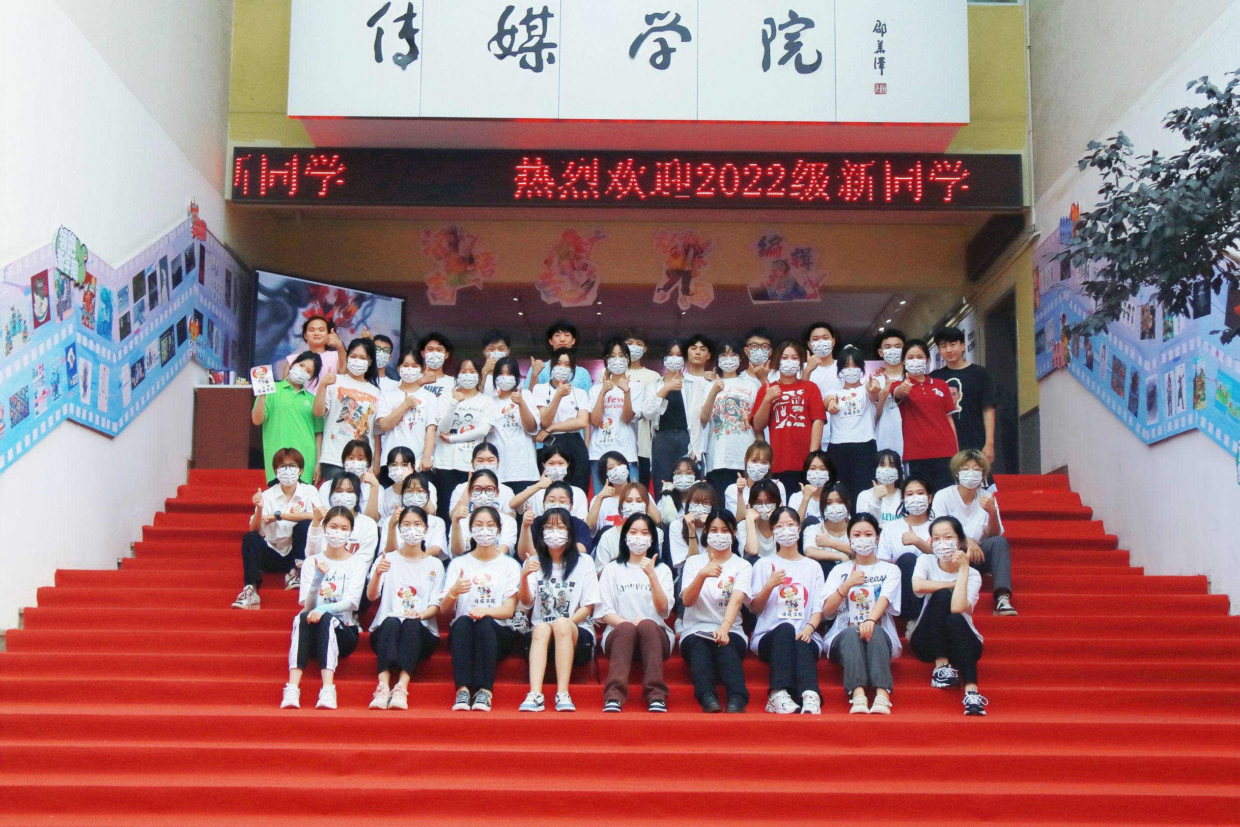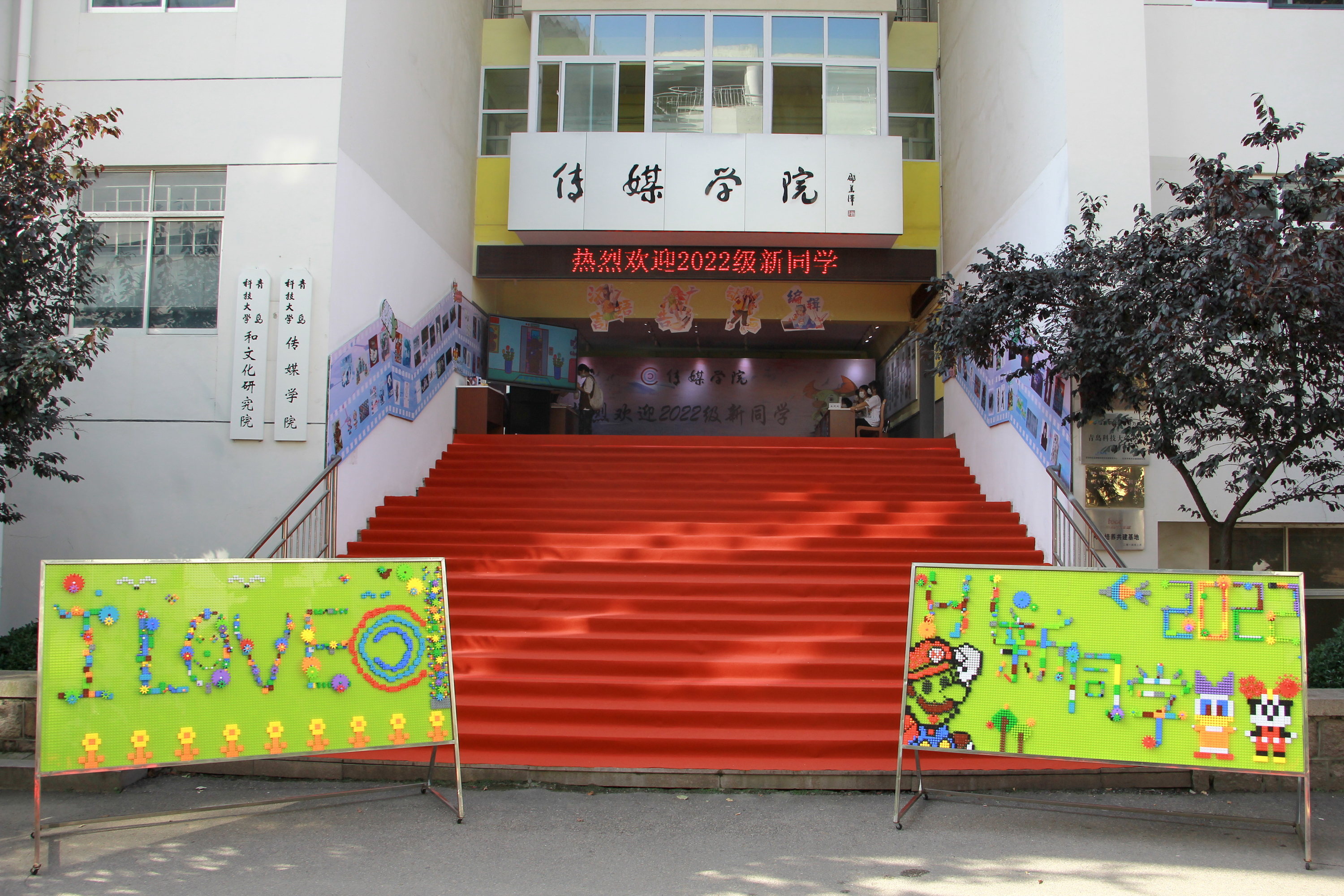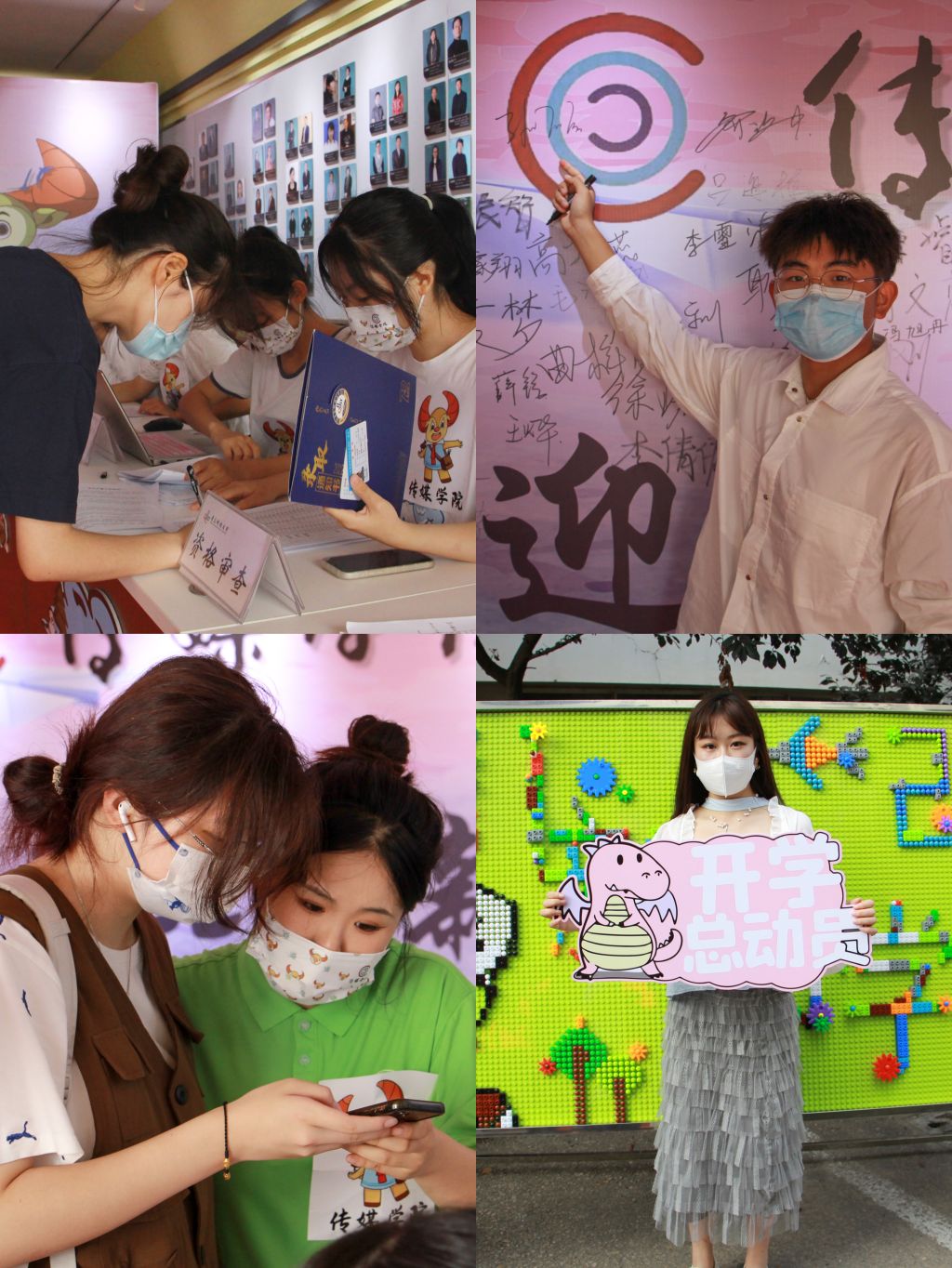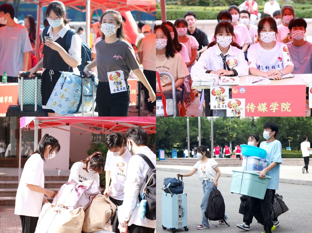 结合实际,发挥专业优势制定特色迎新方案。学生作品展出长廊及精美动漫视频展播让新生在报到过程中近距离接触所学专业,体验专业特色。用乐高积木拼成的“Hi,新同学”系列展板别具一格,吸引过往同学纷纷驻足打卡。踏上红地毯,完成报到手续,新生们在“热烈欢迎2022级新同学”的签名墙上签上自己的名字,留下期待与梦想。新生专属特色口罩和新生大礼包更是让来自五湖四海的传媒学子归属感倍增。