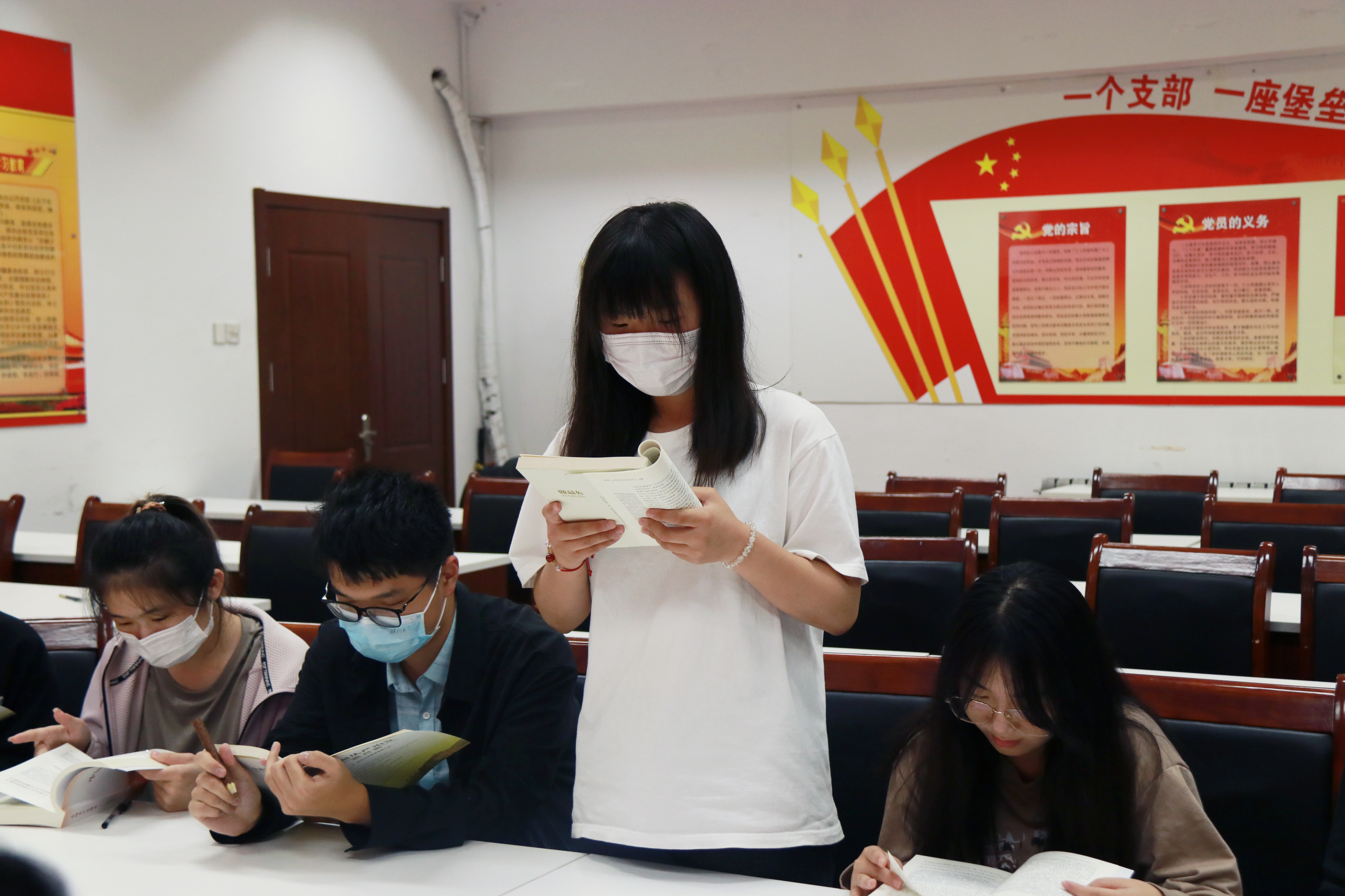 郭艺璇同学朗诵了《中国共产党简史》等书籍中铿锵有力的文字,带我们回望党创立初期投身大革命的艰难险阻,直到夺取民主革命的全国胜利,最终带领中国人民进入社会主义改革开放和现代化建设新阶段的发展壮大过程。