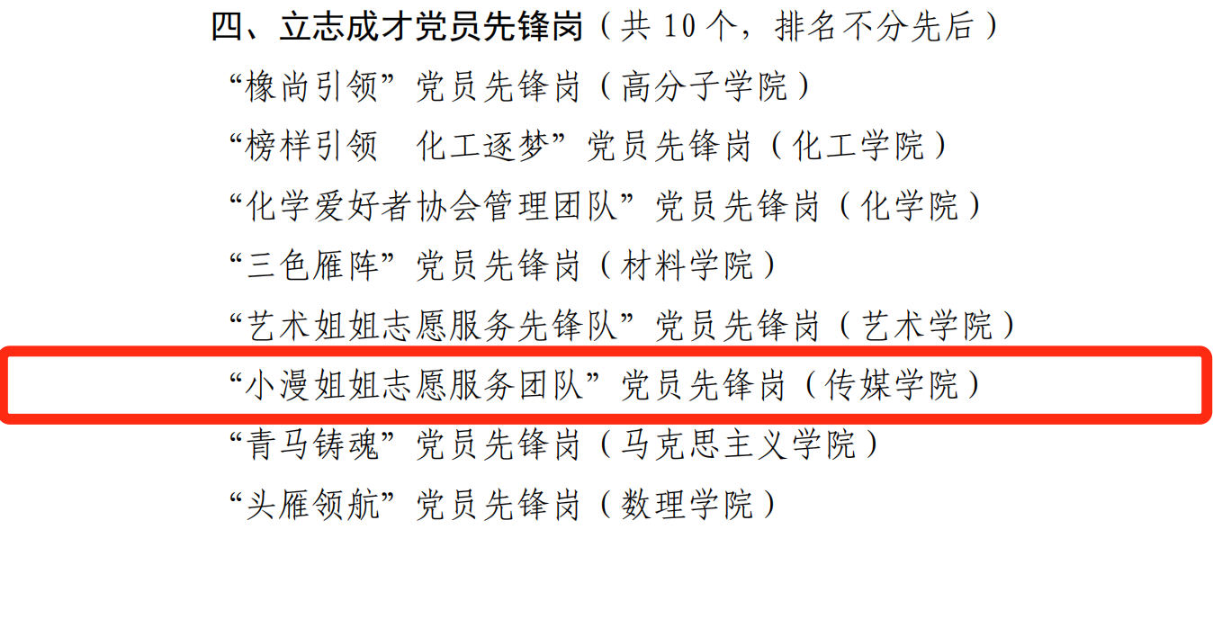 近日,学校首批45个“新时代党员先锋岗”创建评选工作完成,“小漫姐姐志愿服务团队党员先锋岗”获评学校立志成才党员先锋岗。