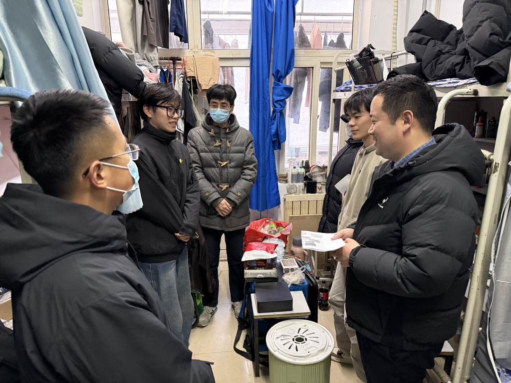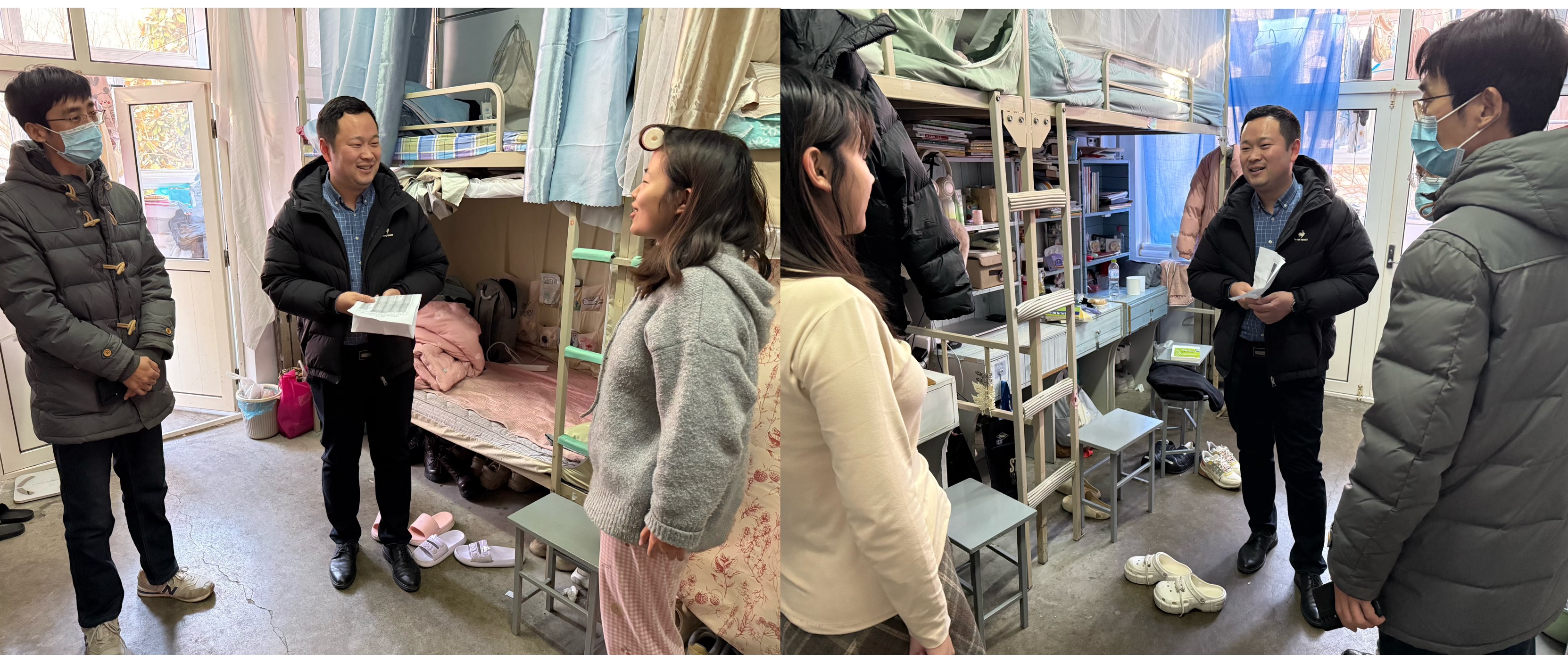 “期末考试还有几门?目前复习进展如何?宿舍暖气热不热?学习生活有啥困难需求?领导老师来访学生应该怎么做?”走访期间,领导老师们与学生深入交流,详细关心同学们的期末考试和生活情况,鼓励同学们积极备考,认真复习,强调了宿舍安全、内务卫生、宿舍文明礼仪等事宜,并指导同学们放假离开宿舍时关好门窗,断水、断电,做好宿舍卫生清洁,做到“离校即返家”,科学规划寒假生活。