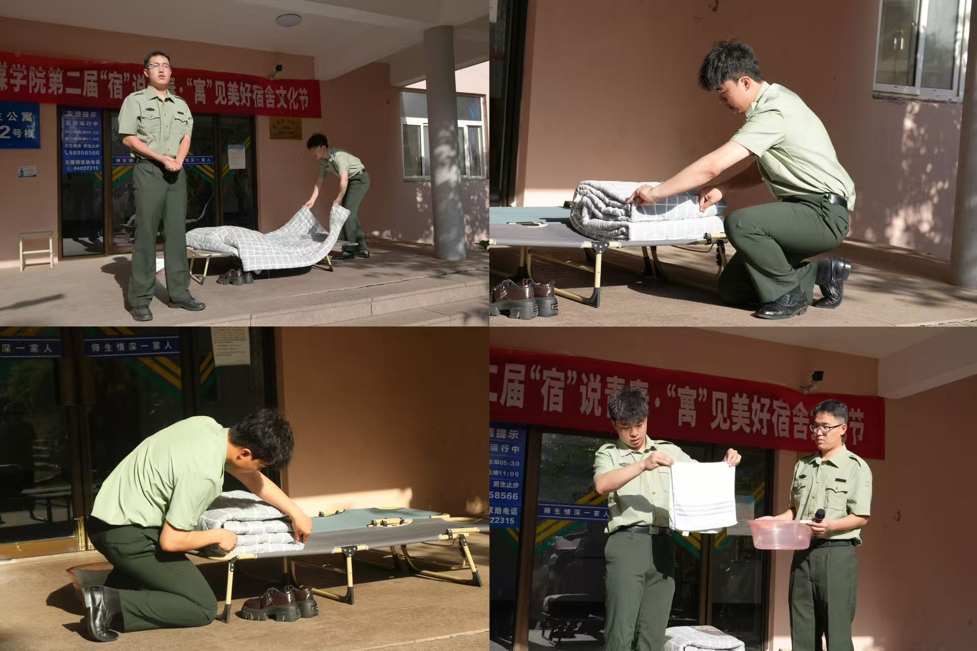 学校军事爱好者协会学生代表进行了规范内务整理标准展示,演示了“三分叠被法”和生活用品的收纳技巧,为学生宿舍日常整理提供了实用参考,引导传媒学子共创文明雅舍。