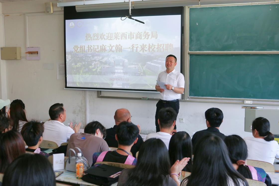 联合莱西市商务局和青岛天才豆图书有限公司等三家对口企业举办“职引未来”2025届毕业生离校前专场招聘宣讲会。莱西市商务局党组书记麻文翰,真人娱乐城