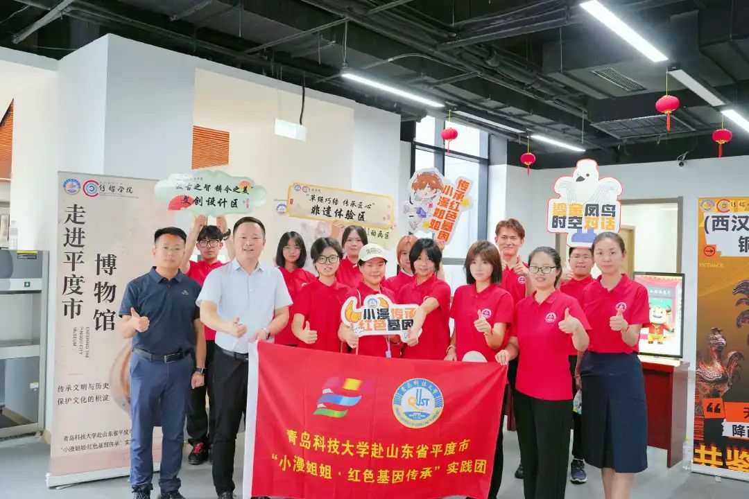 “小漫姐姐·红色基因传承”实践团由10名队员组建,他们充分发挥动画、广告学、编辑出版学等专业优势,在平度市博物馆开展“青春为中国式现代化挺膺担当”暑期专项实践活动。实践团现场重点展示三项特色成果:一是数字赋能,让文物“活”现起来。团队运用AIGC、H5、3D建模等技术实现文物可视化传播,用数字化的叙事语言,赋予馆藏文物全新的表达方式,让沉睡的文物“活”起来,让宝贵的文化资源成为驱动乡村发展的新引擎。二是汲古铸今,文创设计再重构。团队开发融入馆藏文化符号的团扇、书签、明信片、徽章等实用文创,实现传统文化元素向现代生活载体的创新转化,让现场的领导老师、观众把一份独特的“平度记忆”带回家。三是非遗传承,草绳巧结传匠心。团队联合“平度新河草编”非遗手工艺人推动草编文化传承。通过学习麦秆染色、七股编、立体编等核心技艺,充分展现技艺的本真之美。创新引入“文创+数字+非遗”的推广模式,探索文化传承与乡村振兴的融合发展路径,为传统文化注入新时代活力。