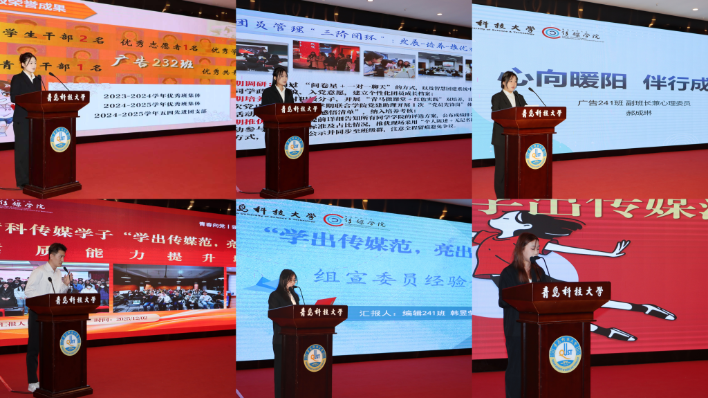 在典型经验交流环节,广告232班班长林姿含、编辑222班团支书张曦、广告241班副班长兼心理委员郝成琳、2024戏影学习委员兼科创委员陈修轲、编辑241班组宣委员韩昱莹、动画241班舍长秦欣茹等六位优秀班委代表依次分享工作心得。他们结合岗位实际,围绕班级凝聚力建设、团支部活力激发、心理关怀实践、学风科创融合、宣传组织创新、宿舍班务联动等方面,以生动案例呈现务实方法,彰显了传媒学生骨干的服务意识、专业思考与担当精神。