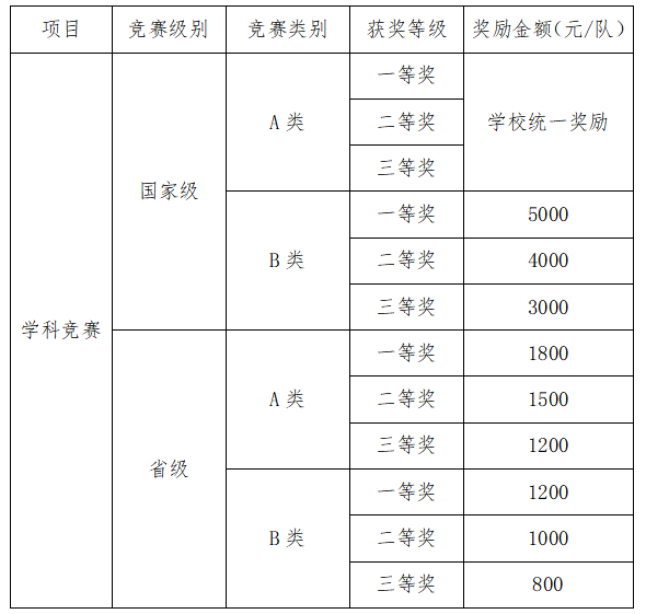 备注:若某项竞赛获奖等级设有“特等奖”,按相应等级一等奖进行奖励。