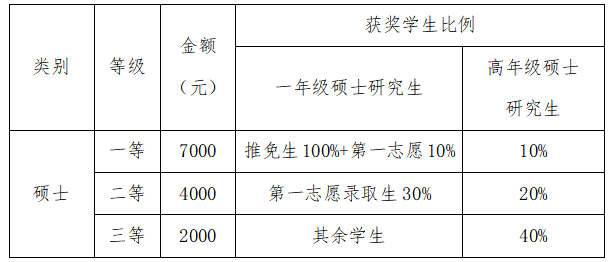 硕士综合奖学金奖励标准及获奖比例如下: