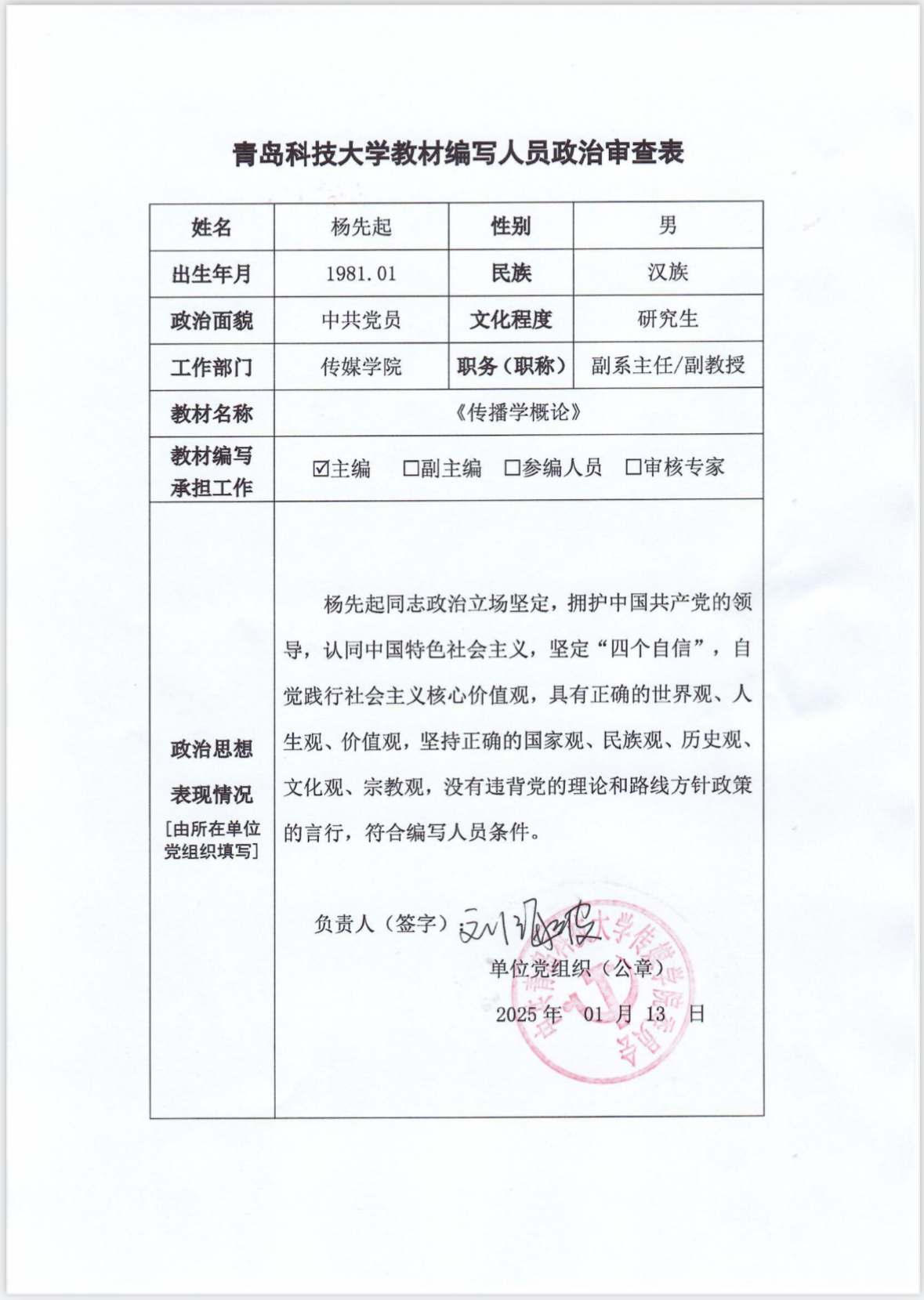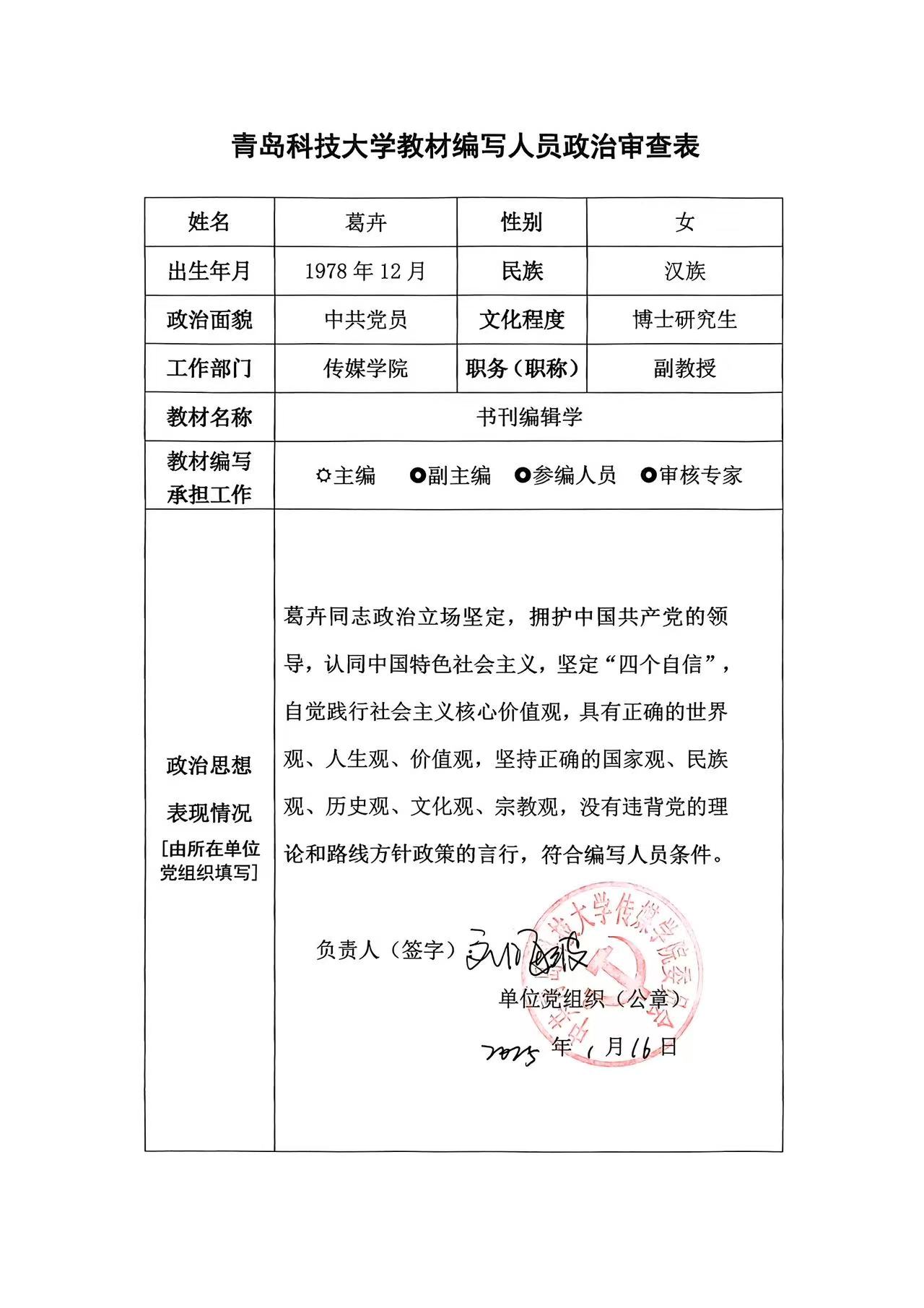 经线上真人娱乐城推荐 党委会审核同意,对教材编写人员葛卉、杨先起、单娟政审情况予以公示,公示期为5天(2025年1月16日-20日),如有异议,请在公示期内向真人娱乐城 教学办反映。