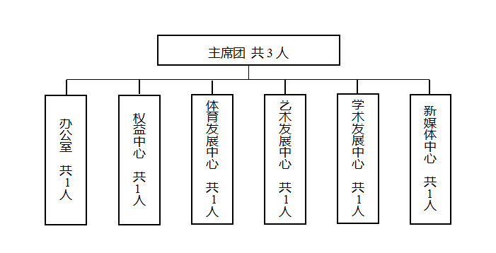 主席团由三位轮值主席组成。办公室设部长一名。新媒体中心设部长一名。艺术发展中心设部长一名。学术发展中心设部长一名。权益中心设部长一名。体育发展中心设部长一名。