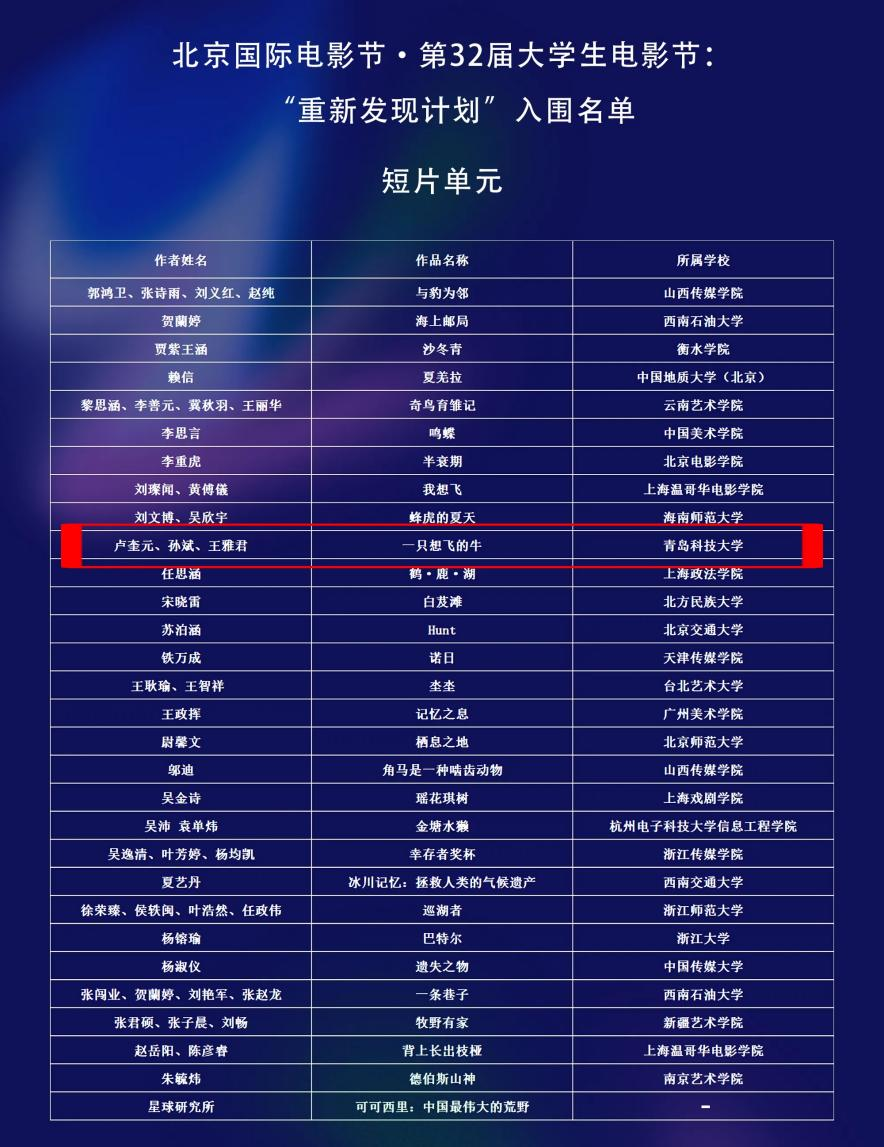 2024级戏剧与影视专业硕士研究生团队创作的短片《一只想飞的牛》成功入围短片单元。“重新发现计划”是北京国际电影节·第32届大学生电影节的特别单元,携手SEE基金会,致力于构建青年影像创作与生态文明的对话桥梁。本届“重新发现计划”征集受到广泛关注,共收到短片、短视频近280部,经过严格评审与多轮打分,最终有46部优秀作品入围终审环节。