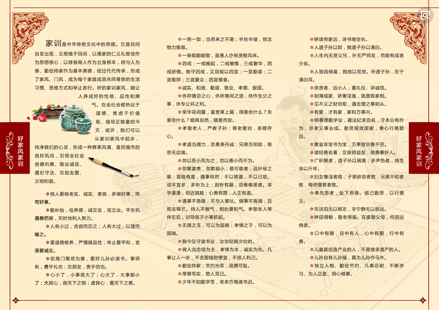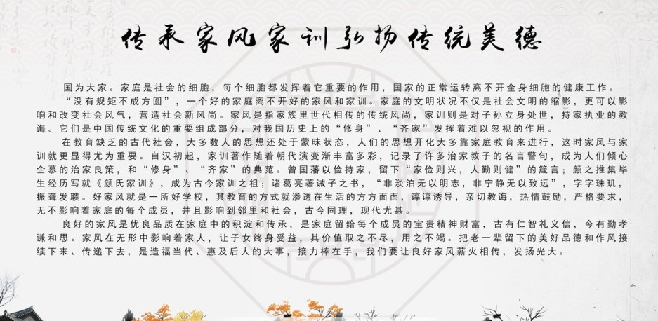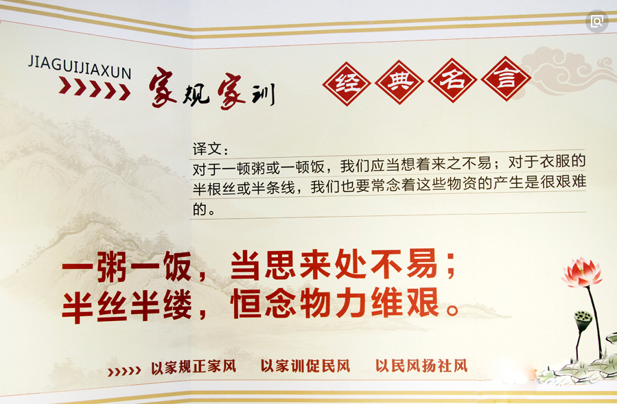 好的家风、家训、家规,是一种无言的教育,人生的宝典。通过浏览这些图片,让广大师生懂得好家风代表的是一家人优良的精神状态和品格修养,我们要从中学习并努力传承这些好家训、好家规、好家风,并自觉践行到日常生活中,建设和睦友爱、孝老爱亲、清正廉洁的优良家风。