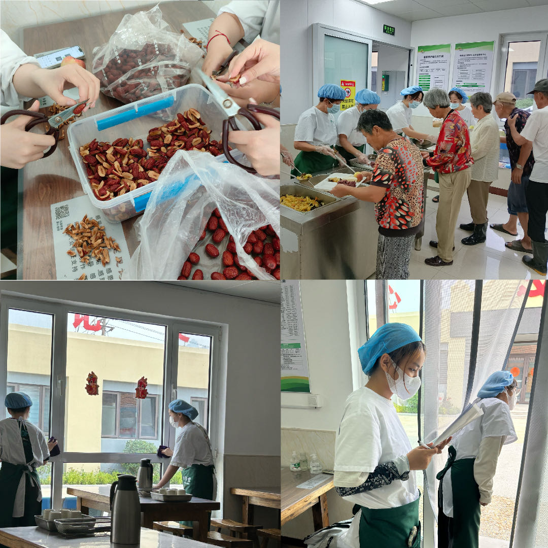 面对每日的打扫清洁、食材准备、对接老人等需精细化的工作,团队成员们通过志愿前辈姐姐们的演示和教导中,快速掌握并各自合理分配了工作,对老人腿脚不便等的各种特殊情况也使队员们在做实事时更加了解思考和体会对于特殊群体应考虑的更细致更实际。面对食材的准备更是要考虑到老人们的牙口和身体情况,例如准备小米红枣粥时,应将红枣的核细心的择好并剪成小块,进门的台阶应小心搀扶。每个老人的不同实际情况问题,使大家所学所想动用不同办法解决。对于特殊群体的关爱从不是单薄的,而是更多的关爱和考虑,暖人心,更现价值。在公益餐厅服务的魅力不止止步与此,在实现自我价值的同时传递社会的温暖,在实践中更思考身处于如此温暖的阳光下能做的更多实质应用。团队队员们在锻炼大学生实践能力的同学,更思考前进目标。