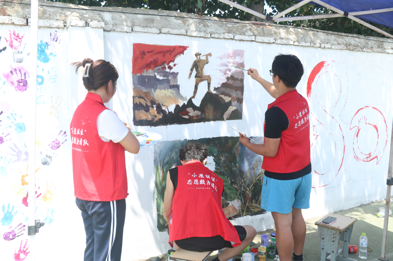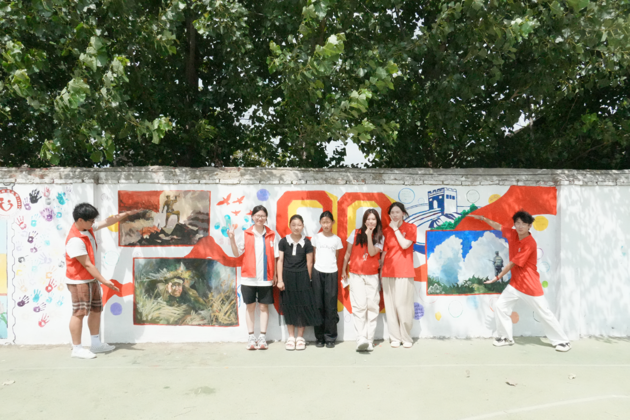 今年是抗日战争胜利 80 周年,队员们带着孩子们一起画了幅特别的墙绘。