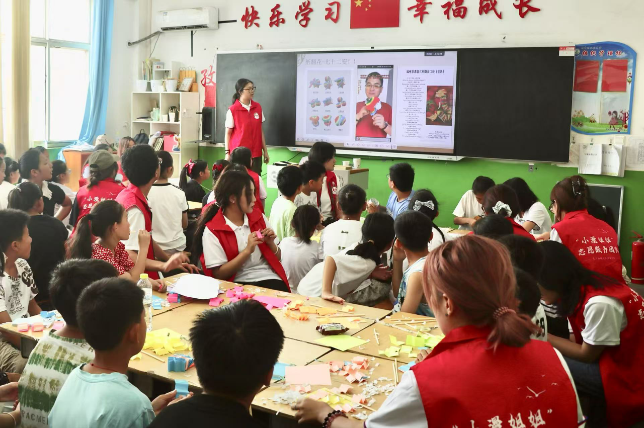 队员陈艺鸣拿着彩纸演示,指尖一动,纸片就变成了展翅的蝴蝶;再一拧,又成了圆滚滚的花篮。孩子们看得目不转睛,手里的纸刚捏稳就急着尝试。“姐姐你看!我转出小金鱼啦!” 曹爱晗举着自己的作品喊,纸角扫到鼻尖,痒得直笑。