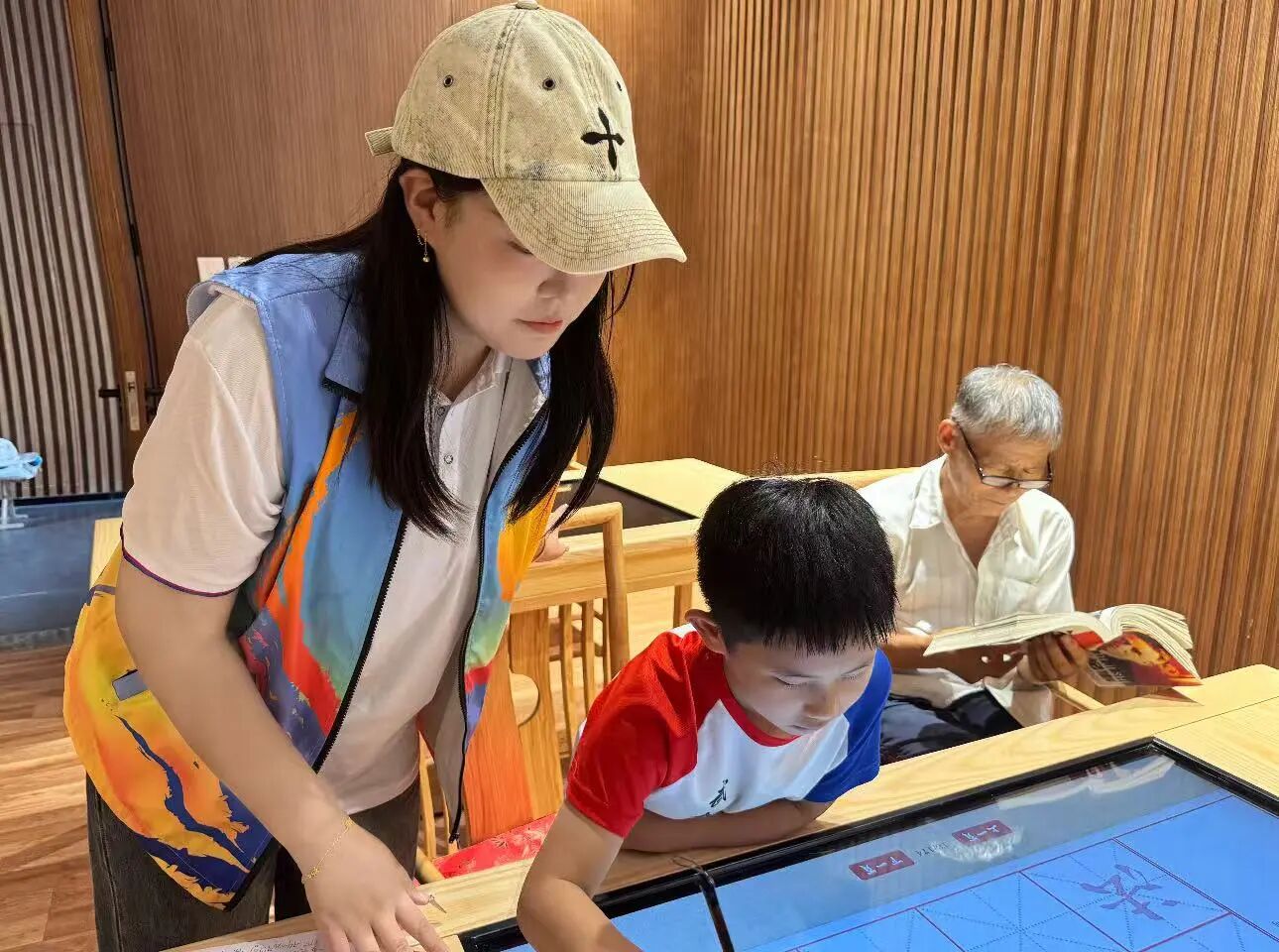团队首站来到国学馆,成员化身文化“引路人”。在智能书法体验区,志愿者耐心指导孩子书写,传统书法与现代科技碰撞,让古老文字 “活” 起来;书架间,成员整理书籍,向读者推介国学经典,让知识触手可及。大家积极践行 “推动国学传承与实践结合,以青春力量赋能文化传播” 宗旨,挖掘国学中的红色价值,用行动诠释文化担当。