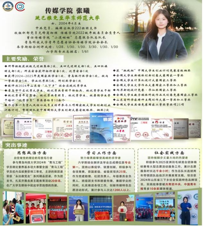 ◆获评2024年山东省“三下乡”社会实践优秀学生、青岛市千名优秀大学生、校优秀共青团干部标兵、校优秀学生干部、校优秀青年志愿者、校优秀共青团员、校优秀学生、校暑期学生骨干培训“优秀学员”等荣誉称号10余个。