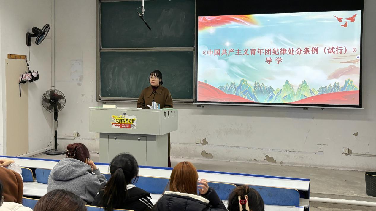 团委副书记兼学工办副主任张鸣围绕《严守团纪:锤炼先进品格与青春担当》展开讲解。她结合典型案例与工作实际,阐释了团的纪律建设的重要性,号召入团积极分子自觉强化组织观念、严守团内规矩,在学习和生活中发挥先锋模范作用,以实际行动展现入青年学生的先进性和纯洁性。