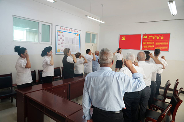 活动期间,志愿者们在莎车县城北街道办事处文化路社区党支部书记李梅的带领下参观了社区党员活动室,社区党员代表正认真学习习近平新时代中国特色社会主义思想。最后,全体党员同志在党旗前合影留念,我们不禁赞叹在庄严党旗的映衬下他们脸上涌现的是对党的绝对忠诚以及对为党工作的无限荣光。