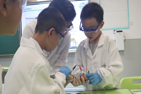 经过短暂的午休,下午三点半,小朋友们乘车来到了海信学校,参观神奇的实验室。在这里,万华的老师带领小朋友们做了三个实验:水果电池、魔法瓶子、舞动的彩虹,在此期间,志愿者和讲课老师一起帮助小朋友。小朋友们戴着护目镜、手套,认真听讲,细心操作,不仅收货了知识,还收获了快乐。