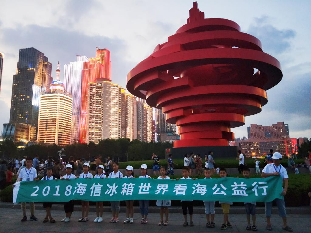 之后志愿者和孩子们来到海信大厦合影留念并在其25楼就餐,孩子们在25楼远眺,面对无际的大海又兴奋起来,欣喜之余竟忘记入座就餐。蔚蓝的大海在孩子们幼小的心里留下美好深刻的回忆,他们的心灵也将像这大海般宽广。晚上志愿者们与孩子们手拉手一起来到附近的五四广场游玩,导游姐姐讲述了五四广场的由来,提醒小朋友们勿忘国耻,懂得感恩。