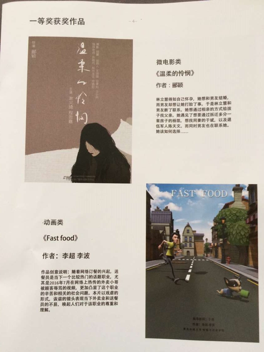 作品《温柔的怜悯》获微电影类一等奖、青岛科技大学作品《Fast food》获动画片类一等奖。